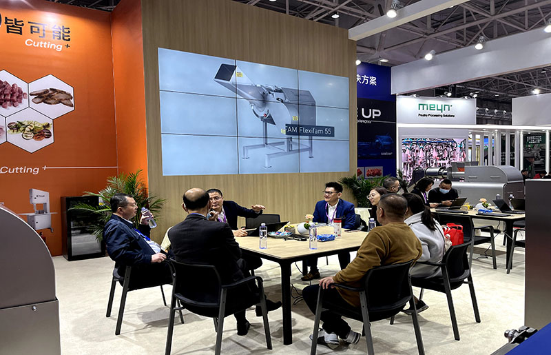 展會(huì)期間,我司展出了眾多設(shè)備:德國(guó)Weber切片線, 德國(guó)Kolbe鋸骨機(jī)K430S,德國(guó)MHS砍排切片機(jī)70-25KM,比利時(shí)FAM凍肉切丁切絲機(jī)CMD.2和加拿大POSS骨肉分離機(jī)Promax 3000。展會(huì)期間,站臺(tái)觀眾絡(luò)繹不絕,我們更是在展會(huì)現(xiàn)場(chǎng)為客戶進(jìn)行試切演示,設(shè)備及演示紛紛吸引了行業(yè)內(nèi)的眾多客戶。